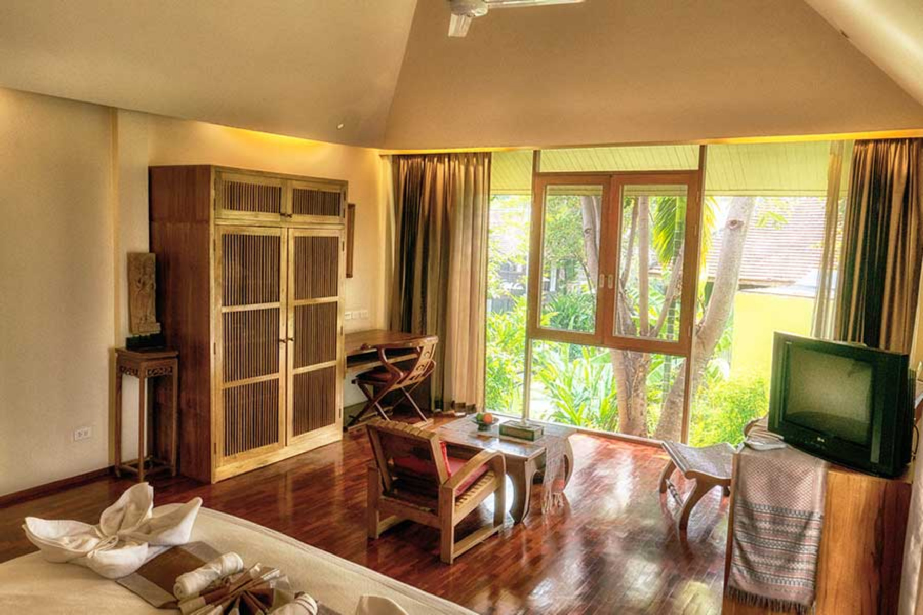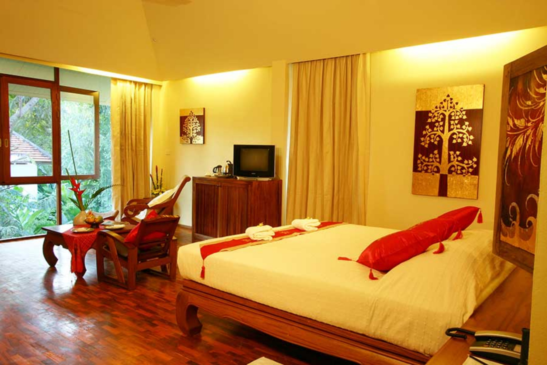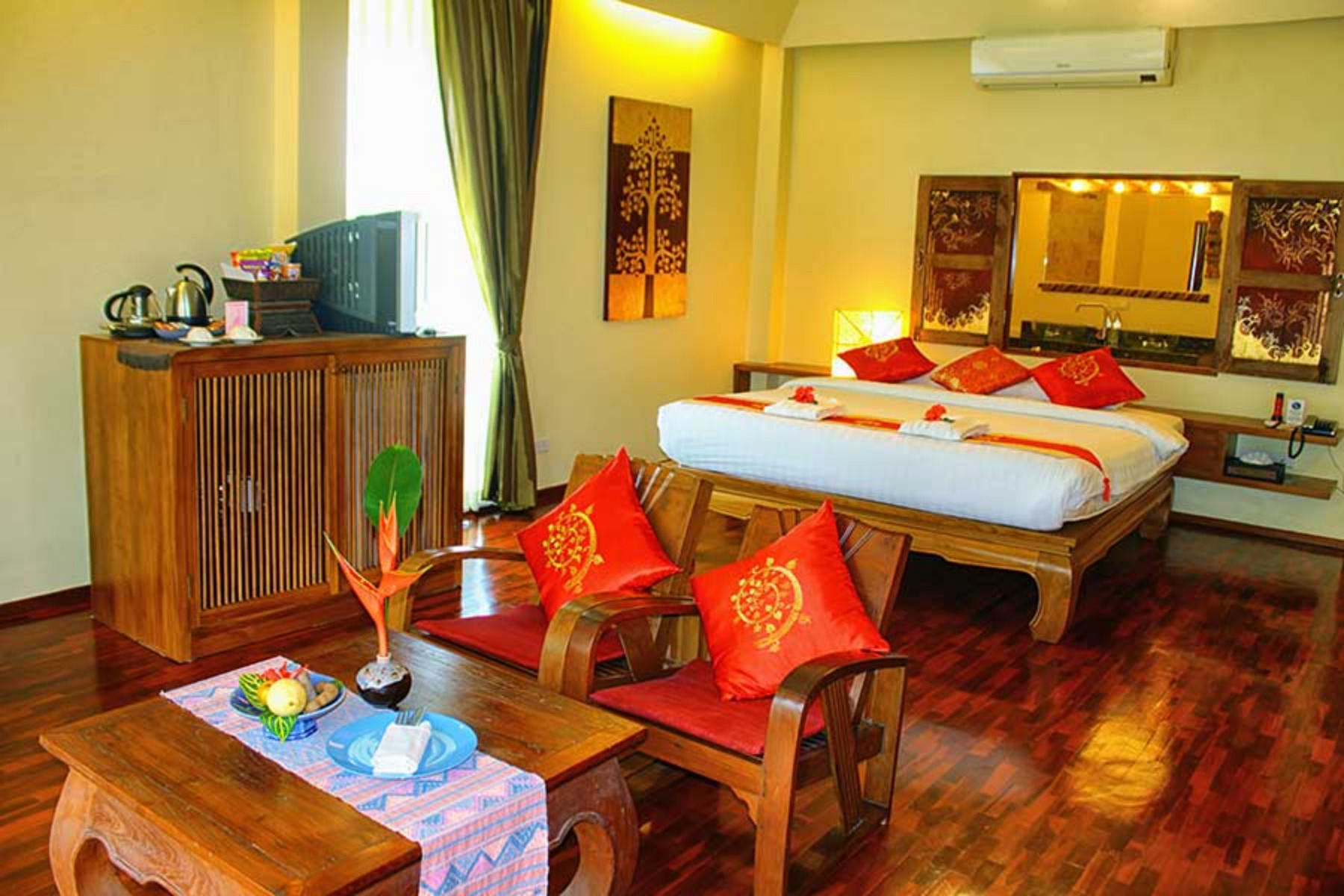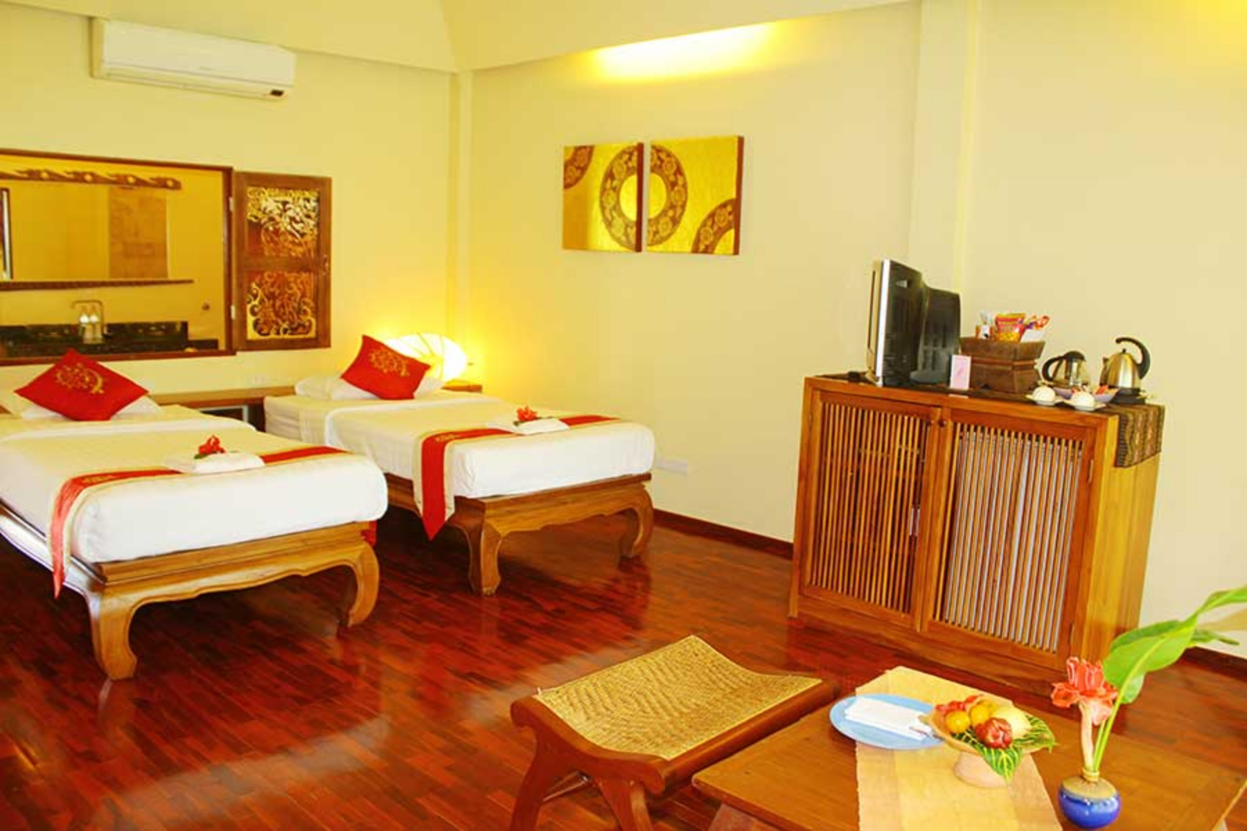Lanna rooms offer comfortable accommodation, located in two of the traditional Lanna villas. They each have a large double bed, a mini-bar, complimentary tea / coffee facilities, CD player, telephone, satellite TV, air-conditioning and fan, and a bathroom with bathtub and separate shower. Lanna rooms are approximatively 30 square meters in size.