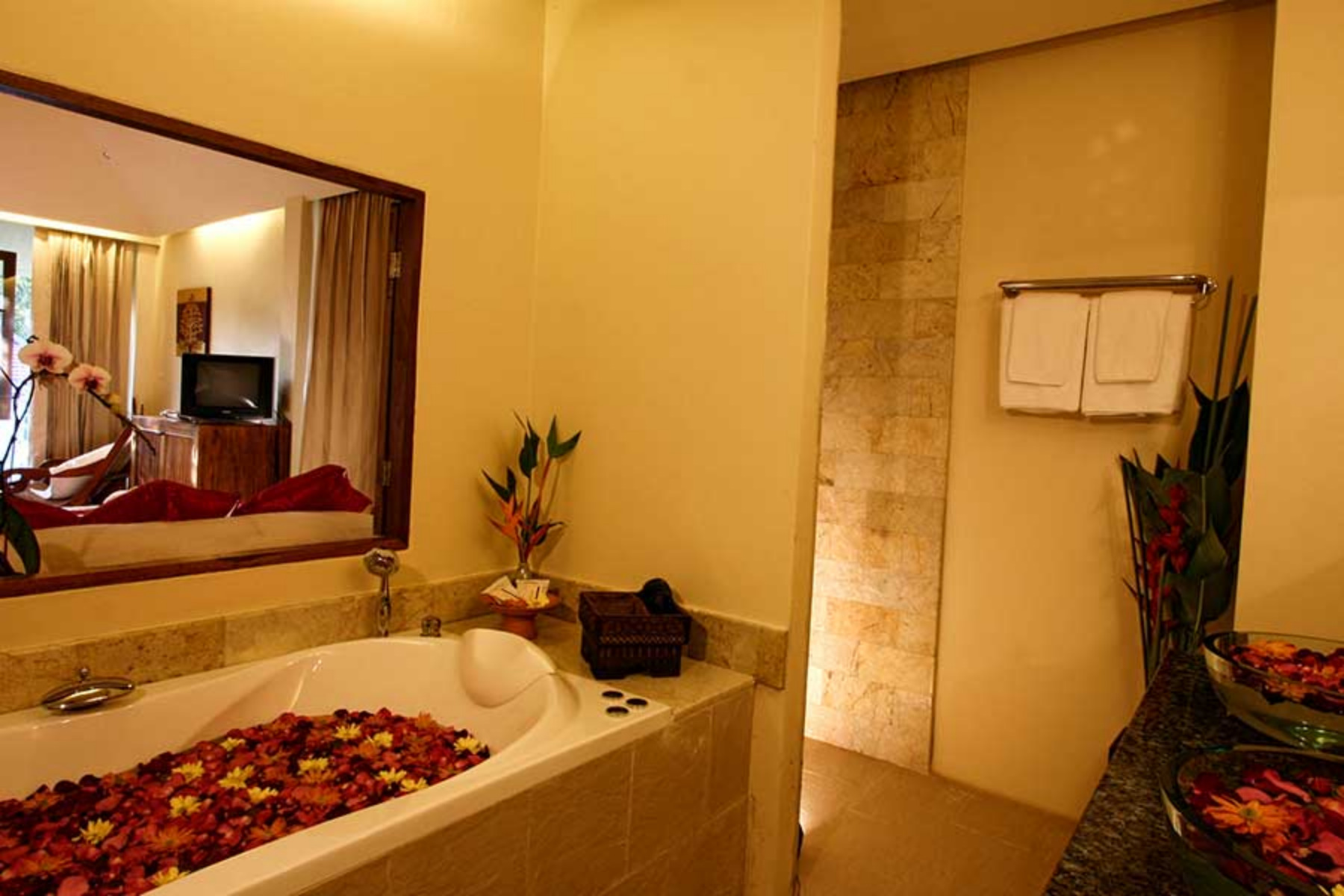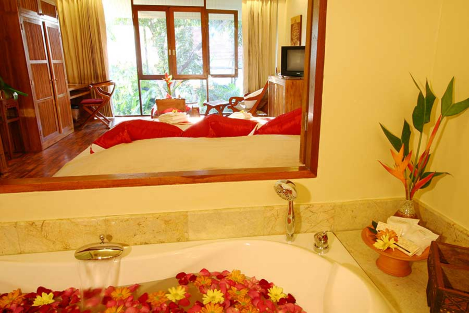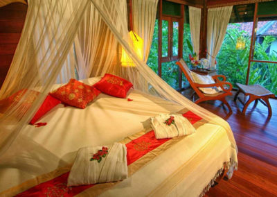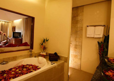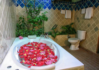 The Jacuzzi Junior Suites are furnished with double or twin beds, teak parquet flooring, air conditioner, fan, mini bar, complimentary tea / coffee set, satellite TV, DVD, stereo, shower, and separate Jacuzzi for two. Jacuzzi Junior Suites are approximatively 45 square meters in size.