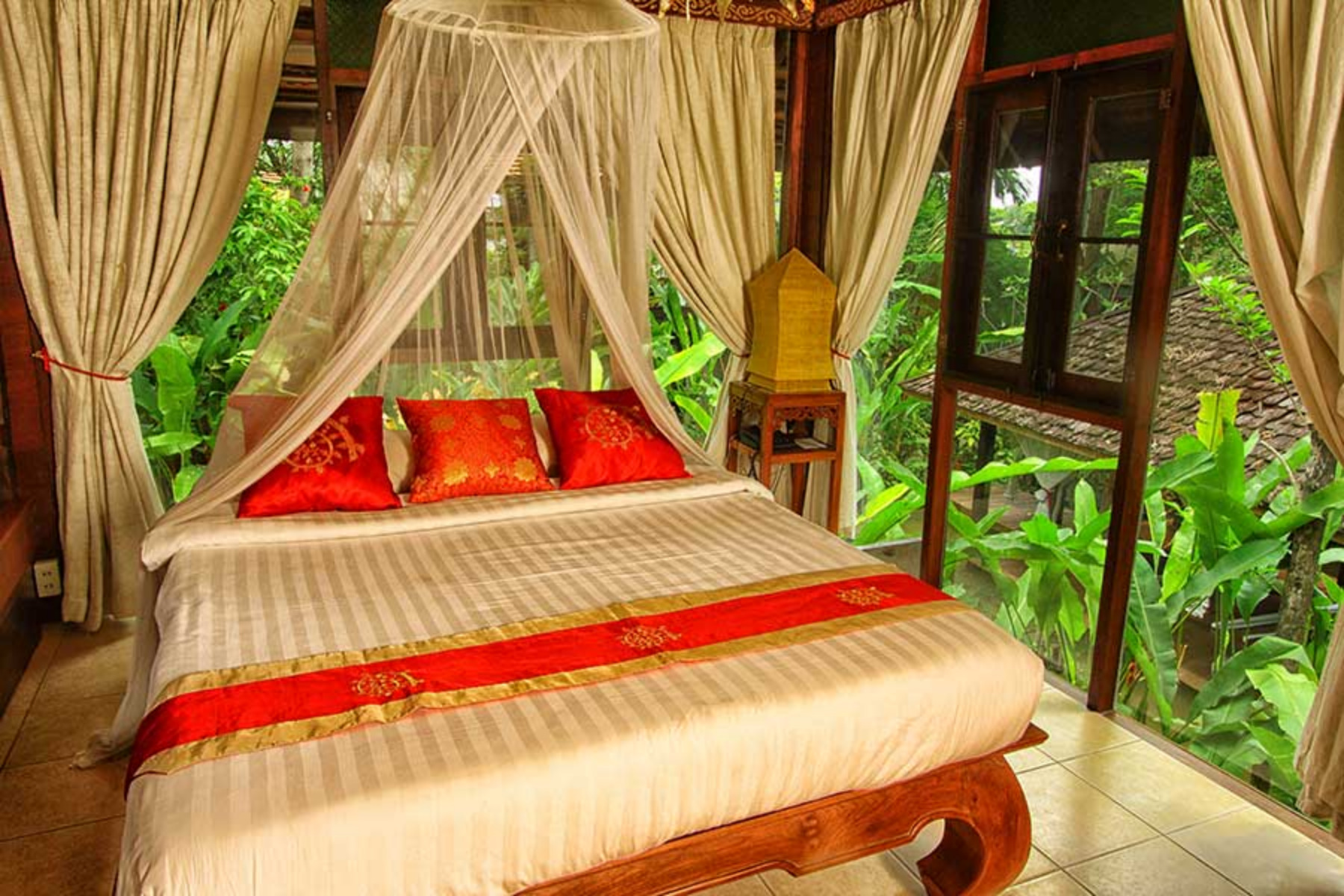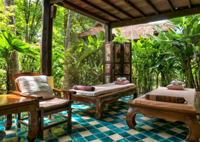 Lanna Spa Villas are traditional Thai Lanna houses on two floors. The ground floor area is open-air with both private sauna and steam room. There are also two treatment or day beds and a dining area. The upper floor has a large double bed, mini-bar, tea / coffee facilities, satellite TV, CD player, telephone, air-conditioning, and fan, as well as a large open-air bathroom with Jacuzzi for two and separate shower.