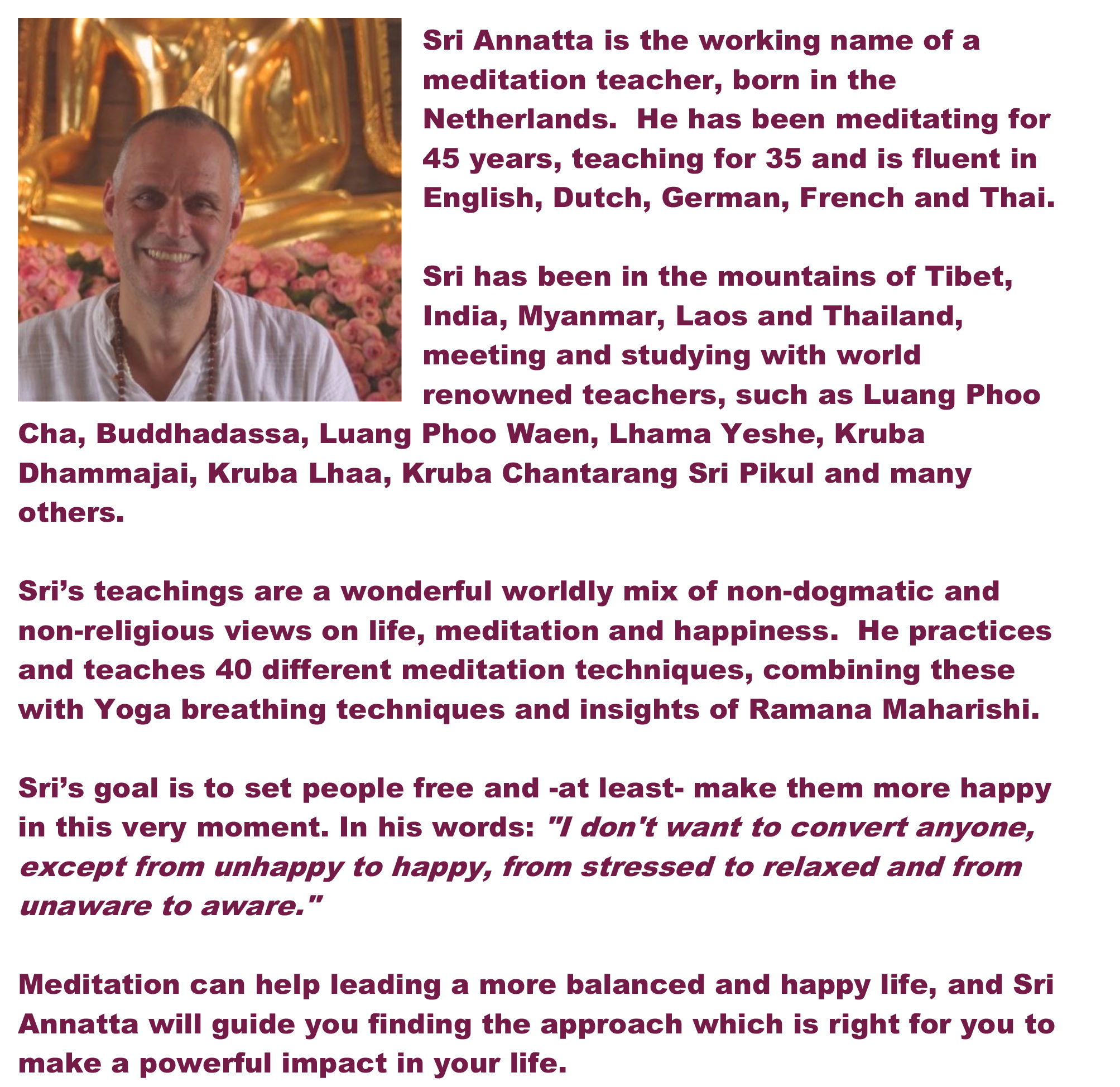 Sri Annatta, born in Holland, has been living in the mountains of Tibet, India, Myanmar, Laos and Thailand, meeting and studying in world renowned teachers. He practices and teaches 40 different mediation techniques and gives conferences about impact of spirituality in your life.